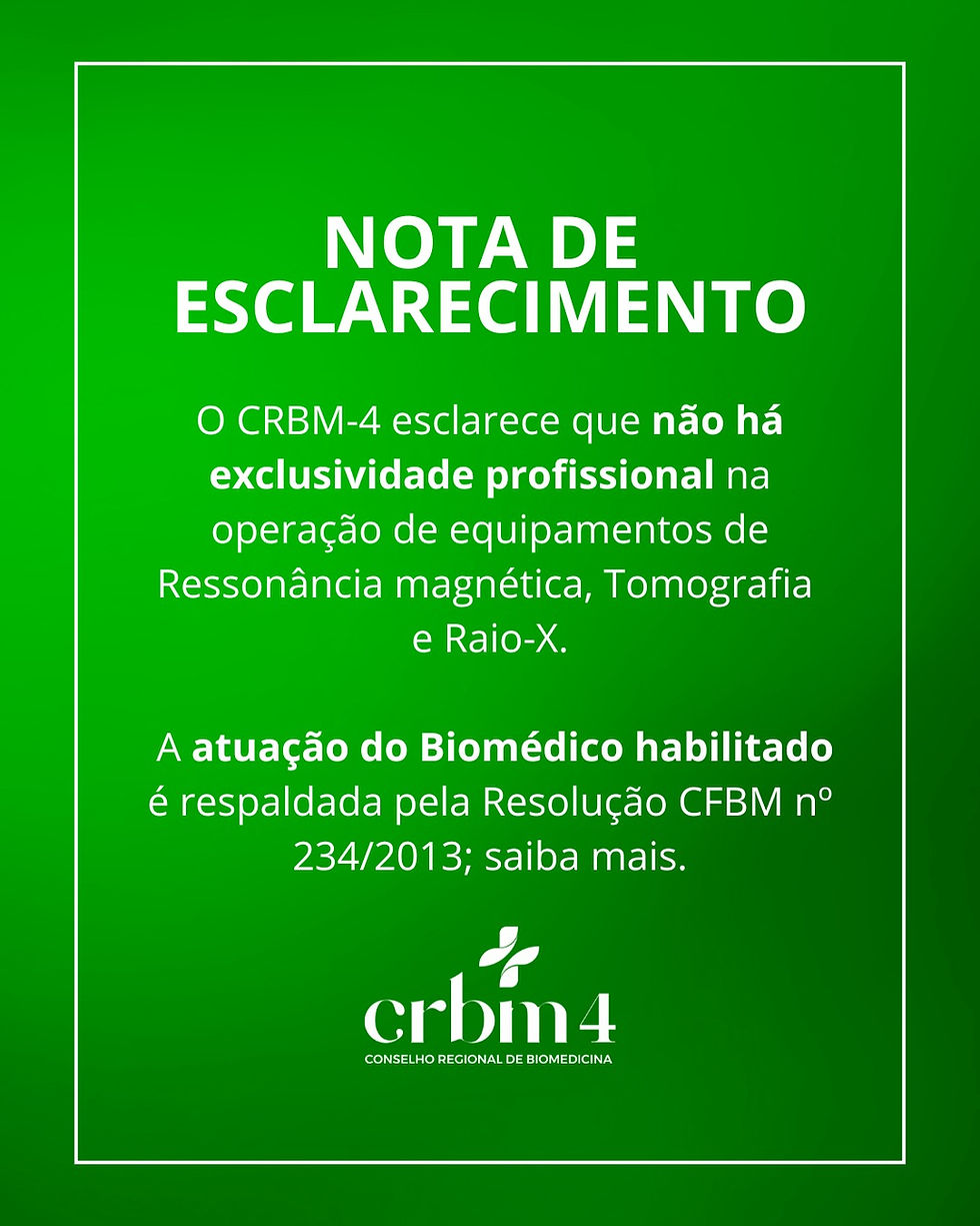 O Conselho Regional de Biomedicina — 4 ª Região no exercício de suas atribuições legais, vem a público esclarecer informações recém publicadas nas redes sociais, afirmando que apenas técnicos e tecnólogos em radiologia estariam legalmente habilitados à operação de equipamentos de Ressonância magnética, Tomografia e Raios-X.
